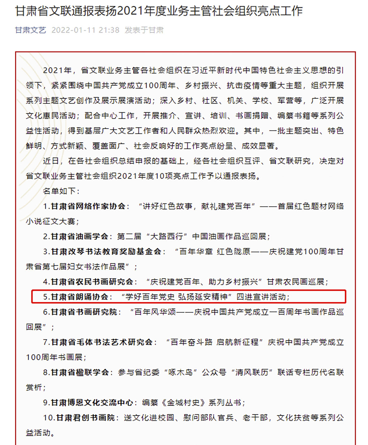 甘肃省朗诵协会“学好百年党史 弘扬延安精神”四进活动获得省文联业务主管社会组织2021年度10项亮点工作,并予以通报表扬。