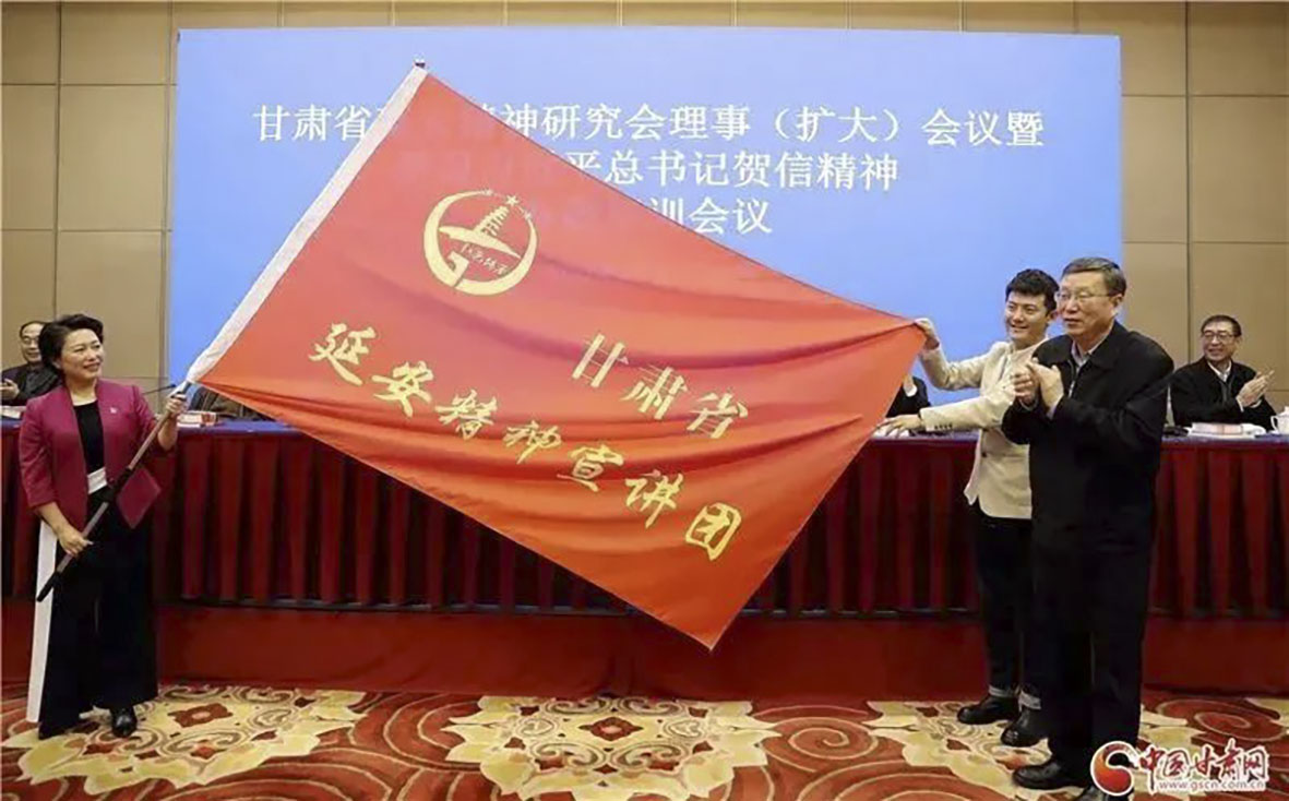 2020年,在习近平新时代中国特色社会主义思想的引领下,紧紧围绕中国共产党成立100周年、乡村振兴等重大主题,甘肃朗协在省委宣传部和甘肃省延安精神研究会的指导下,于芳同志接过省委常委、宣传部长王嘉毅授予的团旗——“甘肃省延安精神宣讲团”,开启了延安精神宣讲“四进”活动。