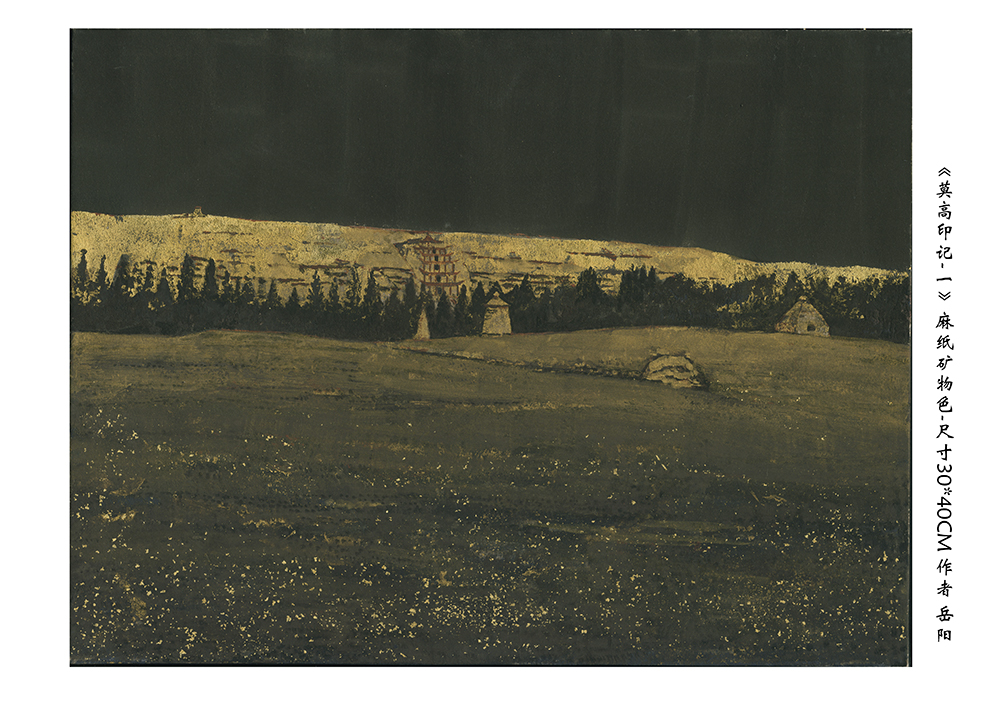 岳阳在敦煌研究院的美术研究及创作工作中充分展现了他壁画专业出身的特点,他所掌握的艺术语言非常丰富,在传统壁画艺术的绘制工艺方面十分娴熟,对壁画艺术的创作热情也体现了从事传统壁画研究的专业画家在艺术创作方面的孜孜不倦的追求。近些年创作的题材主要是对丝路文明的一些个人理解及感悟,如其作品《佛教东来》和《玄奘之路》主要也展现了丝路文明对佛教艺术的发展交流与传承。《玄奘之路》还入选了国家文化旅游部主办的黄河文化主题美术创作项目。