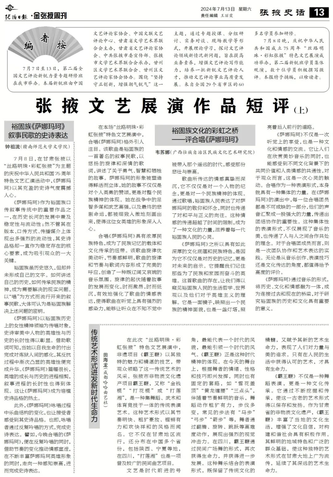 7月12日,由中国文艺评论家协会、中国文联文艺评论中心、甘肃省文学艺术界联合会主办,甘肃省文艺评论家协会、中共张掖市委宣传部、张掖市文学艺术界联合会承办,甘州区文学艺术界联合会、甘州区文艺评论家协会协办的第二届全国文艺评论新锐力量专题研修班在甘肃张掖圆满结业。