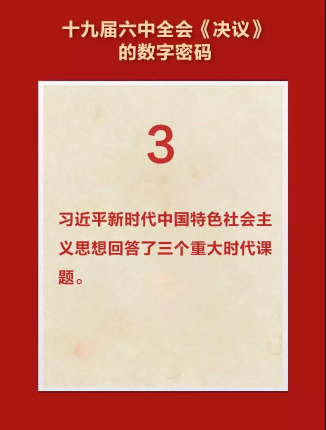 这里的“3”,就是习近平新时代中国特色社会主义思想回答了三个重大时代课题。决议指出,习近平总书记提出的一系列原创性的治国理政新理念新思想新战略,深刻回答了新时代坚持和发展什么样的中国特色社会主义、怎样坚持和发展中国特色社会主义,建设什么样的社会主义现代化强国、怎样建设社会主义现代化强国,建设什么样的长期执政的马克思主义政党、怎样建设长期执政的马克思主义政党这三个重大时代课题。