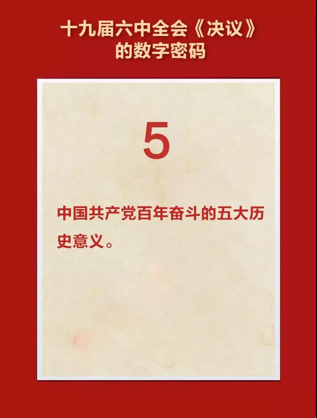 这里的“5”,就是中国共产党百年奋斗的五大历史意义。决议指出,(1)党的百年奋斗从根本上改变了中国人民的前途命运;(2)党的百年奋斗开辟了实现中华民族伟大复兴的正确道路;(3)党的百年奋斗展示了马克思主义的强大生命力;(4)党的百年奋斗深刻影响了世界历史进程;(5)党的百年奋斗锻造了走在时代前列的中国共产党。这五条党的百年奋斗的历史意义,高度凝练地阐明了中国共产党对中国人民、对中华民族、对马克思主义、对人类进步事业、对马克思主义政党建设所作的历史贡献。