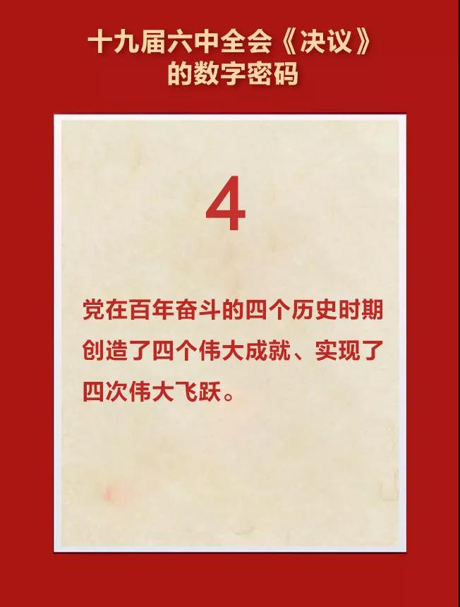 这里的“4”,就是党在百年奋斗的四个历史时期创造了四个伟大成就、实现了四次伟大飞跃。决议指出,一百年来,党领导人民浴血奋战、百折不挠,创造了新民主主义革命的伟大成就;自力更生、发愤图强,创造了社会主义革命和建设的伟大成就;解放思想、锐意进取,创造了改革开放和社会主义现代化建设的伟大成就;自信自强、守正创新,创造了新时代中国特色社会主义的伟大成就。党在这四个历史时期领导人民依次实现了中国从几千年封建专制政治向人民民主的伟大飞跃;实现了一穷二白、人口众多的东方大国大步迈向社会主义社会的伟大飞跃;推进了中华民族从站起来到富起来的伟大飞跃;中华民族迎来了从站起来、富起来到强起来的伟大飞跃。