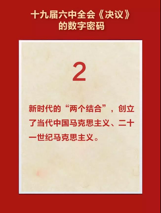 这里的第二个“2”,就是新时代的“两个结合”,创立了当代中国马克思主义、二十一世纪马克思主义。决议指出,以习近平同志为主要代表的中国共产党人,坚持把马克思主义基本原理同中国具体实际相结合、同中华优秀传统文化相结合,坚持毛泽东思想、邓小平理论、“三个代表”重要思想、科学发展观,深刻总结并充分运用党成立以来的历史经验,从新的实际出发,创立了习近平新时代中国特色社会主义思想。这个思想是当代中国马克思主义、二十一世纪马克思主义,是中华文化和中国精神的时代精华,实现了马克思主义中国化新的飞跃。