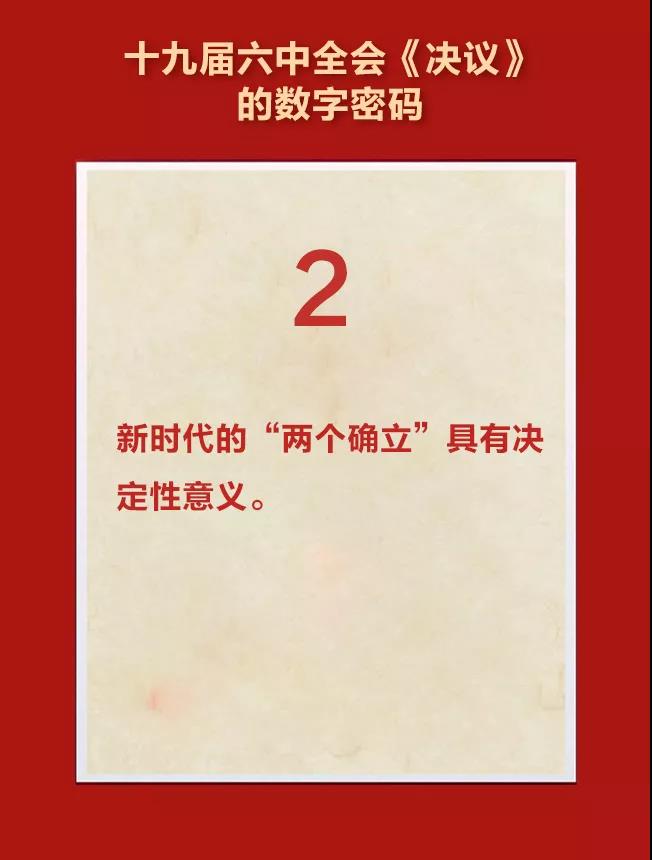 这里的“2”,就是新时代的“两个确立”具有决定性意义。决议指出,我们党确立习近平同志党中央的核心、全党的核心地位,确立习近平新时代中国特色社会主义思想的指导地位,对新时代党和国家事业发展、对推进中华民族伟大复兴历史进程具有决定性意义。