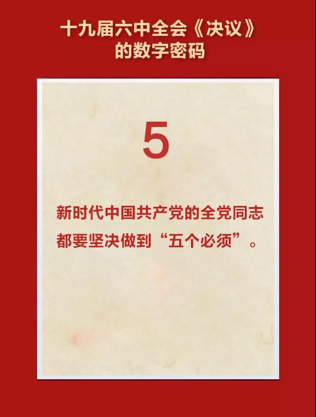 这里的第二个“5”,就是新时代中国共产党的全党同志都要坚决做到“五个必须”。决议指出,(1)全党必须清醒认识到,中华民族伟大复兴绝不是轻轻松松、敲锣打鼓就能实现的;(2)全党必须坚持马克思列宁主义、毛泽东思想、邓小平理论、“三个代表”重要思想、科学发展观、全面贯彻习近平新时代中国特色社会主义思想;(3)全党必须永远保持同人民群众的血肉联系;(4)全党必须铭记生于忧患、死于安乐,常怀远虑、居安思危;(5)全党必须抓好后继有人这个根本大计,以顺应党和人民事业发展呼唤一代代中国共产党人接续奋斗的需要。这五条是以习近平同志为核心的党中央号召全党全国各族人民“勿忘昨天的苦难辉煌,无愧今天的使命担当,不负明天的伟大梦想”,以史为鉴、开创未来,埋头苦干、勇毅前行,为实现第二个百年奋斗目标、实现中华民族伟大复兴的中国梦而不懈奋斗。