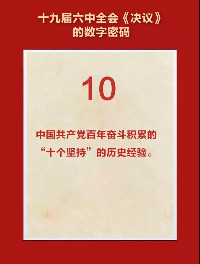 这里的第二个“10”,就是中国共产党百年奋斗积累的“十个坚持”的历史经验。决议科学总结的这“十个坚持”的历史经验依次是:(1)坚持党的领导;(2)坚持人民至上;(3)坚持理论创新;(4)坚持独立自主;(5)坚持中国道路;(6)坚持胸怀天下;(7)坚持开拓创新;(8)坚持敢于斗争;(9)坚持统一战线;(10)坚持自我革命。这些经过党百年奋斗、长期积累的宝贵历史经验,是党和人民共同创造的精神财富,必须倍加珍惜、长期坚持,并在新时代长期实践中不断丰富和发展。