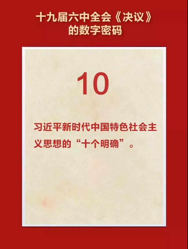 这里的“10”,就是习近平新时代中国特色社会主义思想的“十个明确”。决议指出,习近平新时代中国特色社会主义思想的科学内涵的“十个明确”是:(1)明确中国特色社会主义最本质的特征、中国特色社会主义制度的最大优势是中国共产党领导;(2)明确坚持和发展中国特色社会主义,总任务是实现社会主义现代化和中华民族伟大复兴;(3)明确新时代我国社会主要矛盾是人民日益增长的美好生活需要和不平衡不充分发展之间的矛盾;(4)明确中国特色社会主义事业的总体布局、战略布局;(5)明确全面深化改革总目标;(6)明确全面依法治国总目标;(7)明确必须坚持和完善社会主义基本经济制度;(8)明确党在新时代的强军目标;(9)明确中国特色大国外交;(10)明确全面从严治党的战略方针。这“十个明确”,是中国共产党对中国特色社会主义建设规律认识深化和理论创新的重大成果。