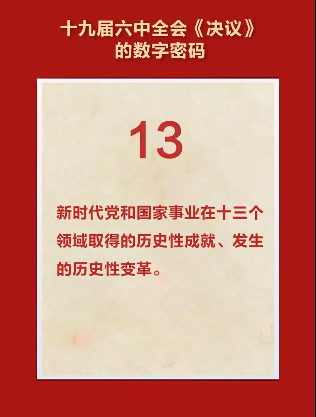 这里的“13”,就是新时代党和国家事业在十三个领域取得的历史性成就、发生的历史性变革。决议从坚持党的全面领导、全面从严治党、经济建设、全面深化改革开放、政治建设、全面依法治国、文化建设、社会建设、生态文明建设、国防和军队建设、维护国家安全、坚持“一国两制”和推进祖国统一、外交工作等13个领域,分领域总结新时代党和国家事业取得的历史性成就、发生的历史性变革,重点总结9年来的原创性思想、变革性实践、突破性进展、标志性成果。